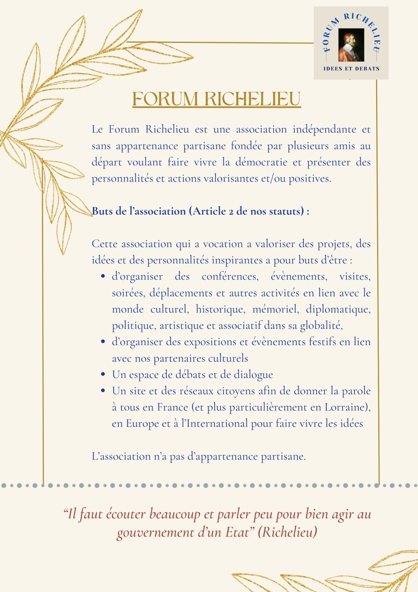 Pourquoi Richelieu ? Car il est souvent considéré comme l'un des fondateurs majeurs de l'État moderne en France en rénovant la vision de la raison d'État et en faisant de celle-ci la clef de voûte de ses méthodes de gouvernement et de sa conception de la diplomatie et de la politique. Parfois admiré, souvent détesté, il reste un illustre personnage de notre Histoire et un homme aux convictions profondes à l'image de nos portraits.